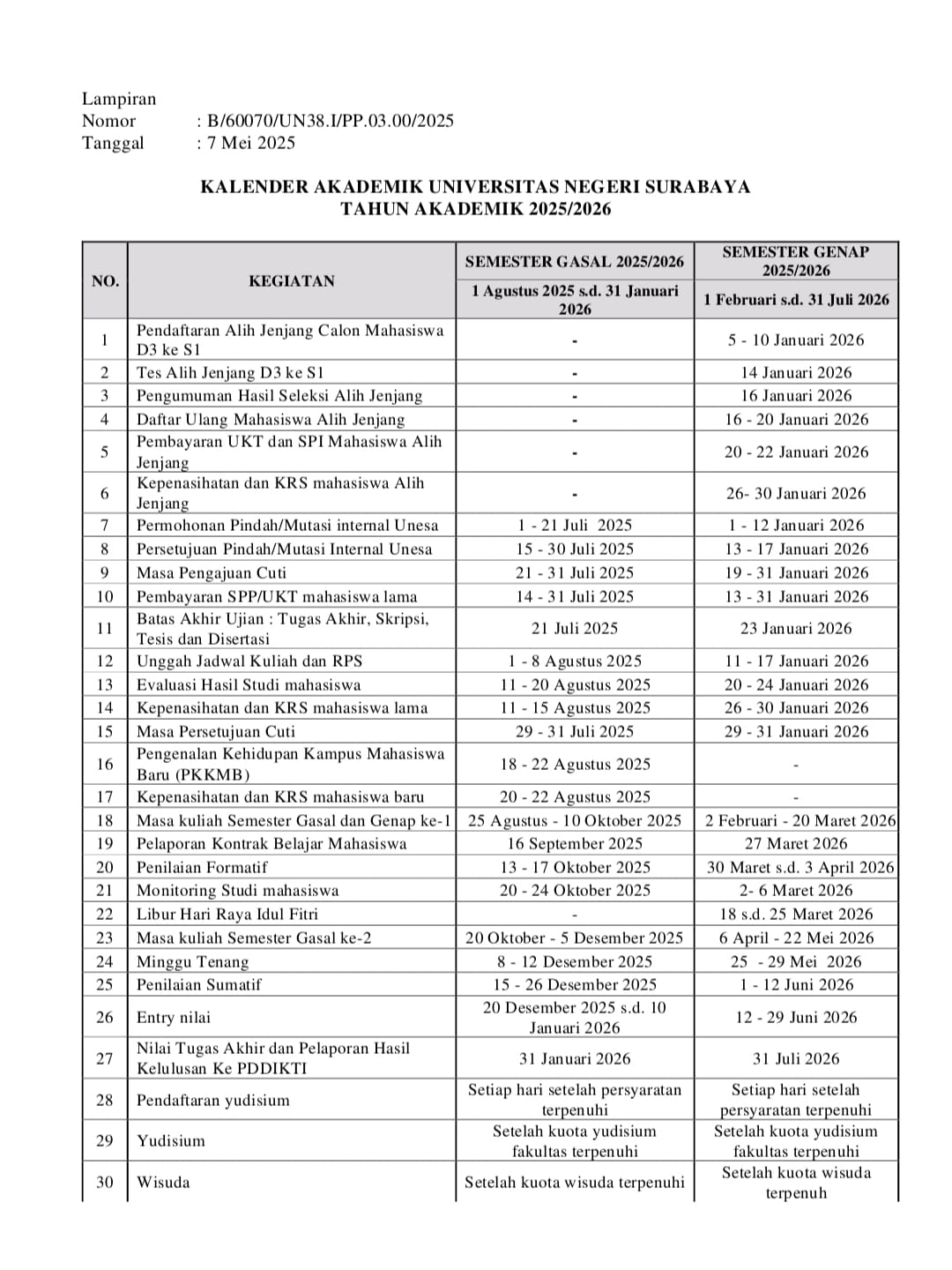 Kepada seluruh civitas akademika Program Studi Teknologi Pangan dan Hasil Pertanian FKP Unesa, berikut kami informasikan Kalender Akademik UNESA tahun akademik 2025/2026